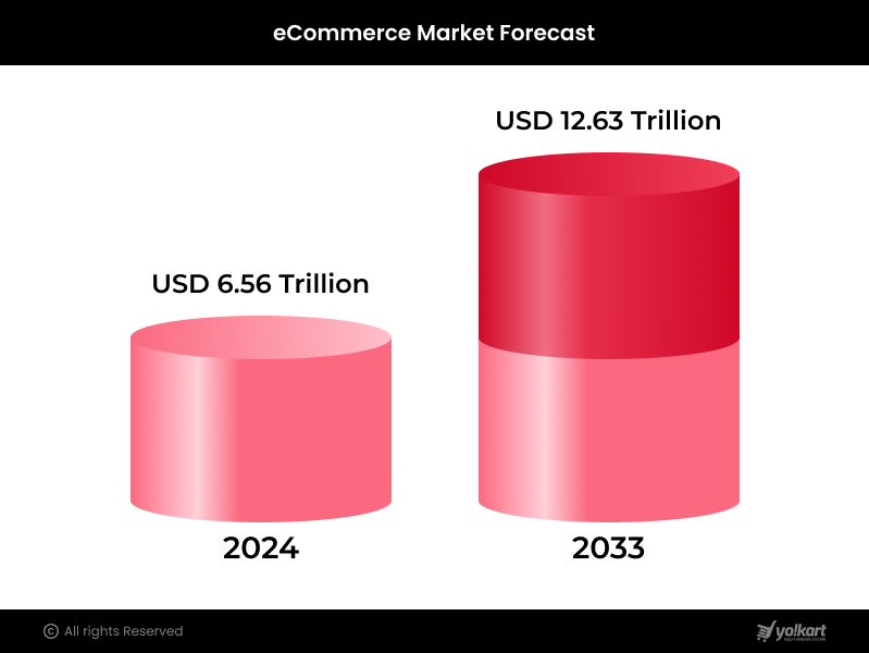 A global eCommerce market research report released on 12th Nov 2025 by ResearchAndMarkets suggests that the worldwide eCommerce market is expected to reach $12.63 trillion by 2033, growing at a CAGR of 7.54% from 2025. According to the report, the global eCommerce market size in 2024 was recorded $6.56 trillion.