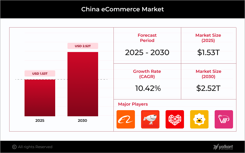 Ans. According, several reports and insights, China has the largest eCommerce market based on size and the US is the second. The eCommerce market size of China is 1.53 trillion in 2025 and is forecast to reach USD 2.52 trillion by 2030.