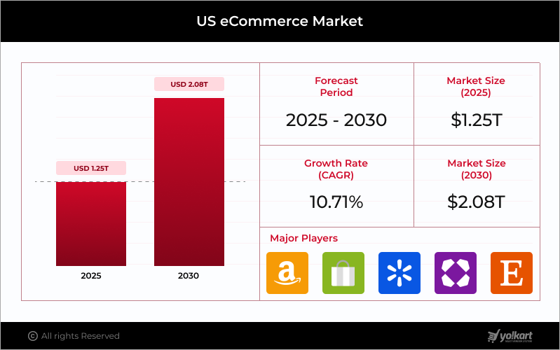 Ans. The US is the second-largest country in the world after China, with an eCommerce market size of 1.25 trillion in 2025. However, the market size is expected to grow at a CAGR of 10.71% to reach $2.08 trillion by 2030.