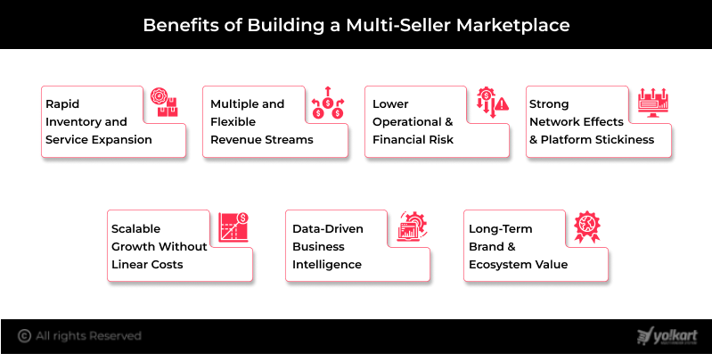 Building a multi-seller marketplace offers strategic advantages that extend far beyond traditional eCommerce models. By enabling multiple sellers to operate on a single platform, marketplace owners can unlock scalability, diversification, and long-term growth with significantly lower operational risk. Let’s have a look at some of the benefits of building a multi-seller marketplace: