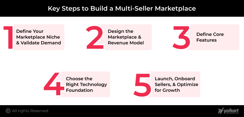 Building a multi-seller marketplace is a strategic process that brings together business goals, user needs, and technology choices. Instead of overloading the journey with too many phases, focusing on a few critical steps helps accelerate execution while setting the foundation for long-term scalability.