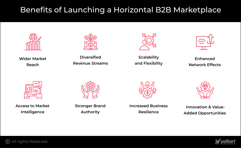 Launching a horizontal B2B marketplace offers numerous advantages for businesses, investors, and vendors alike. By catering to multiple industries, these platforms create opportunities that go beyond the limitations of traditional B2B operations. Here’s a detailed look at the key benefits: