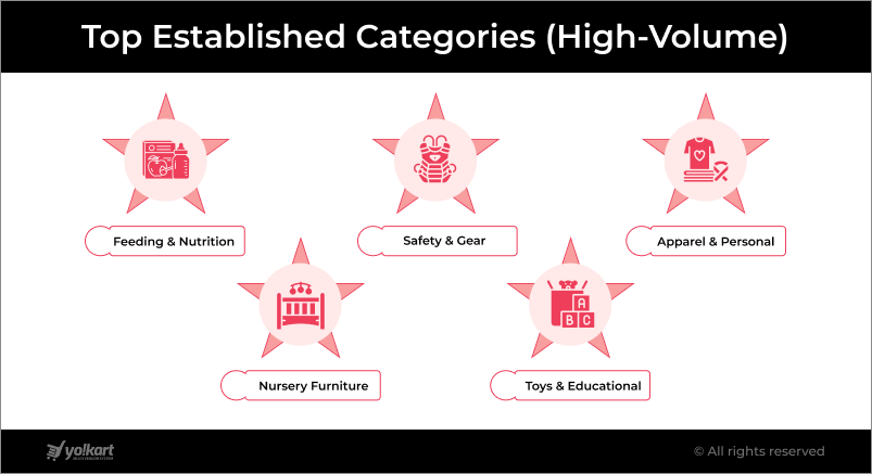 A successful marketplace for baby and kids’ products must cater to established high-demand sectors while actively seeking out lucrative, low-competition niches. Moreover, the baby and kids’ market is constantly evolving, driven by shifting parental priorities, making it essential to balance popular product segments with innovative offerings that address emerging needs and create a distinct competitive advantage.