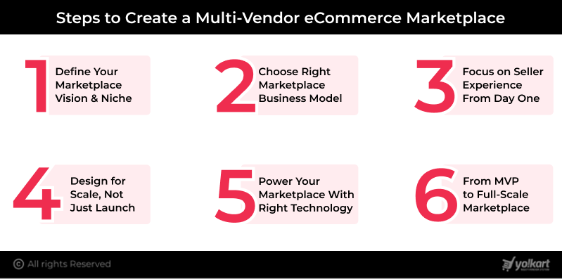 While the opportunity is massive, success depends heavily on the foundation you choose. From technology architecture to monetization flexibility, every decision made at the early stage determines how well your marketplace scales in the long run. Further, below are the steps to create a multi-vendor eCommerce marketplace: