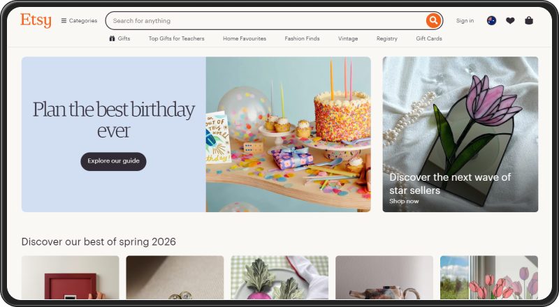 Etsy connects independent creators and small businesses directly with buyers who are looking for personalized or handcrafted products. The platform’s niche positioning helps it maintain a strong and loyal community of buyers and sellers.