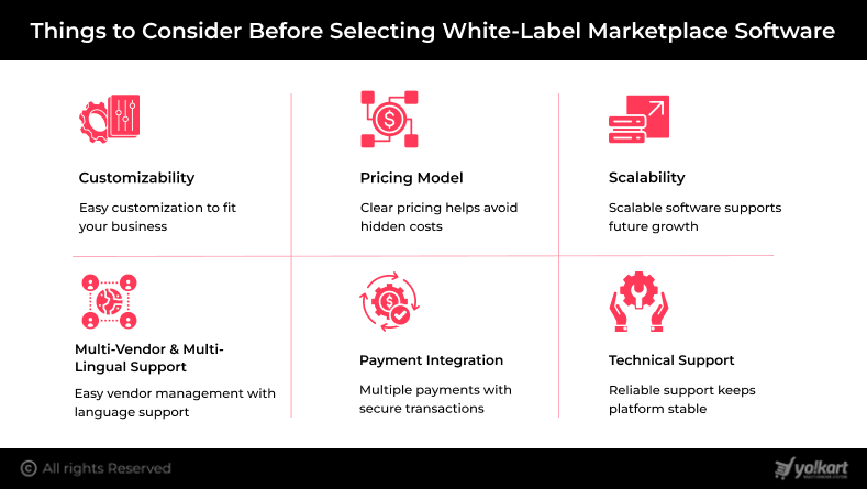 Selecting the right white-label marketplace software is a crucial decision that directly impacts your platform’s performance, scalability, and long-term success. Since this software serves as the foundation of your marketplace, evaluating the right factors beforehand can help you avoid costly limitations and future rework.
